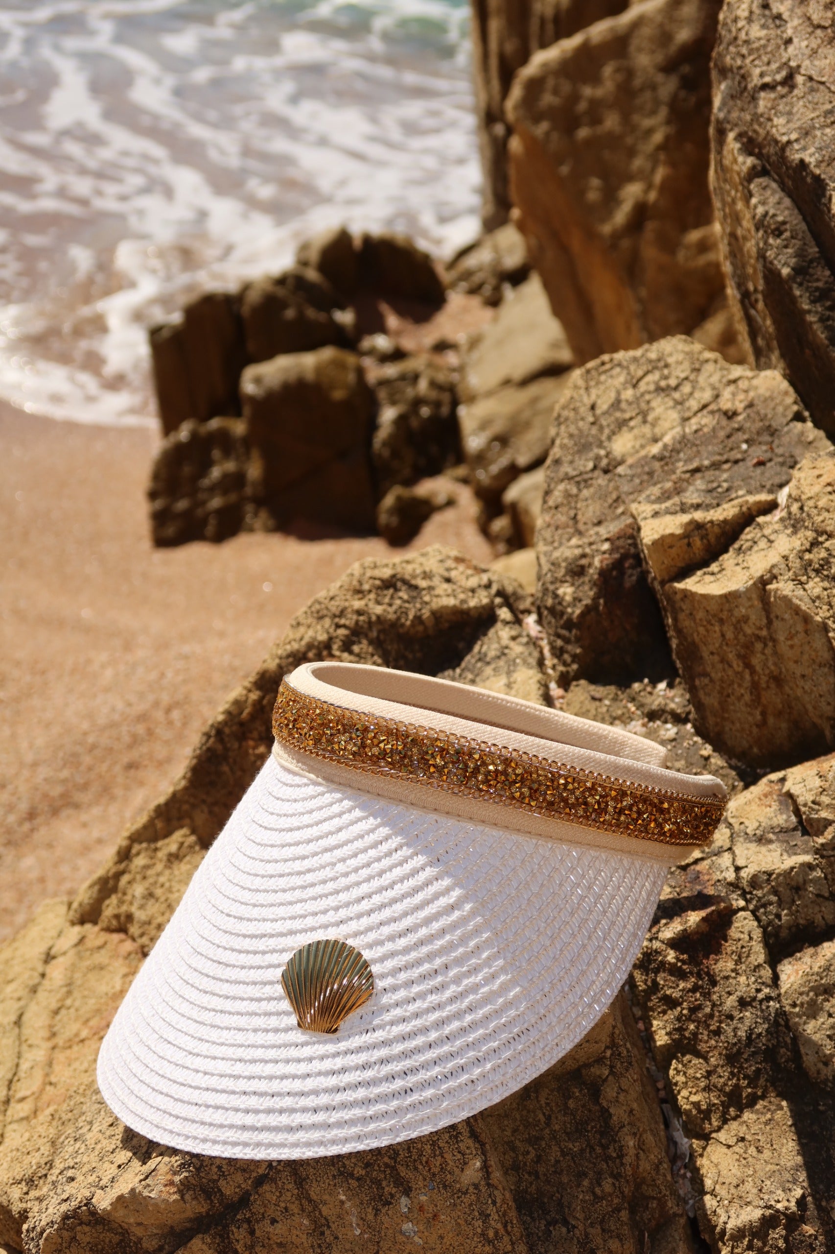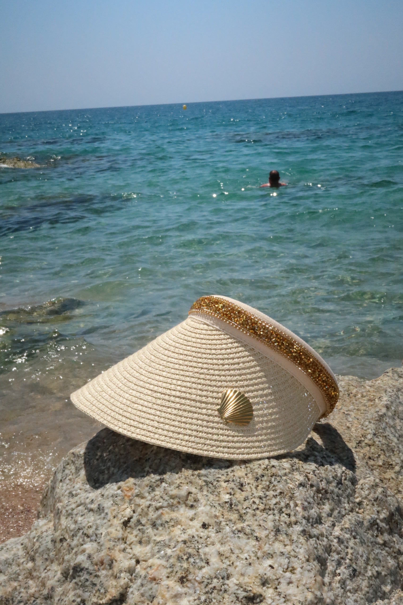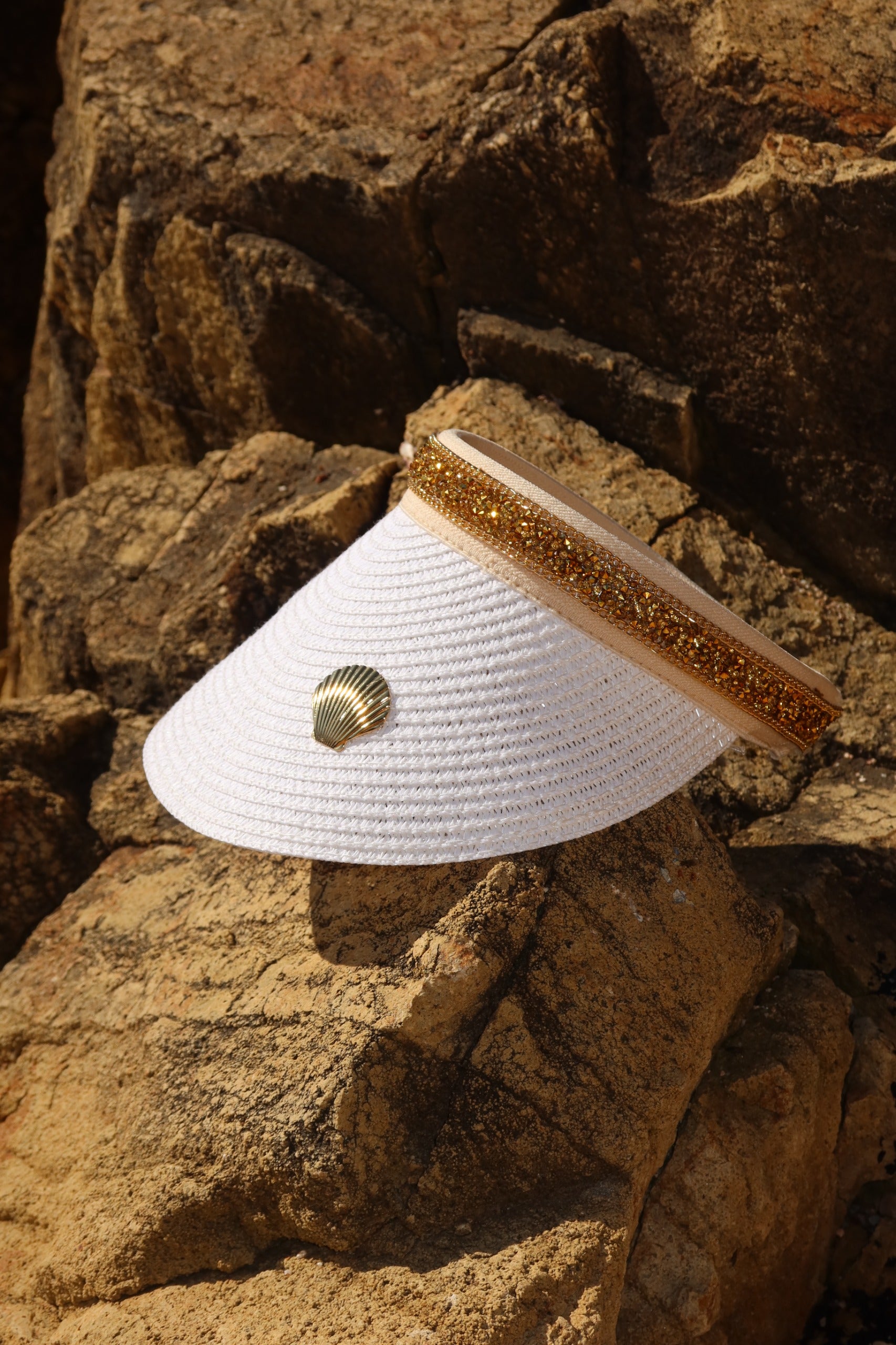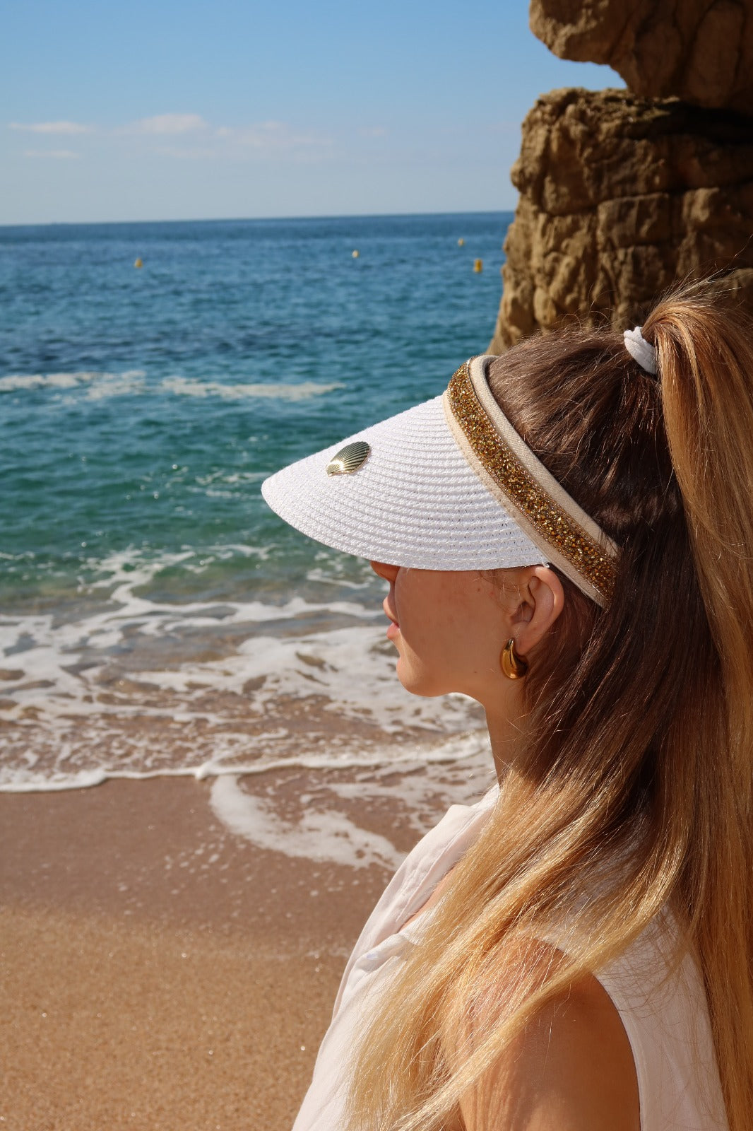 Con cinta luminosa y caracol metálico, es la visera que transforma cualquier look en elegancia veraniega.