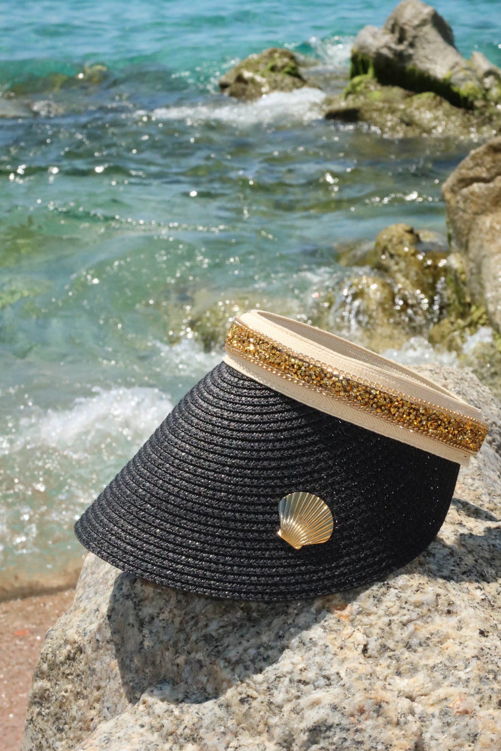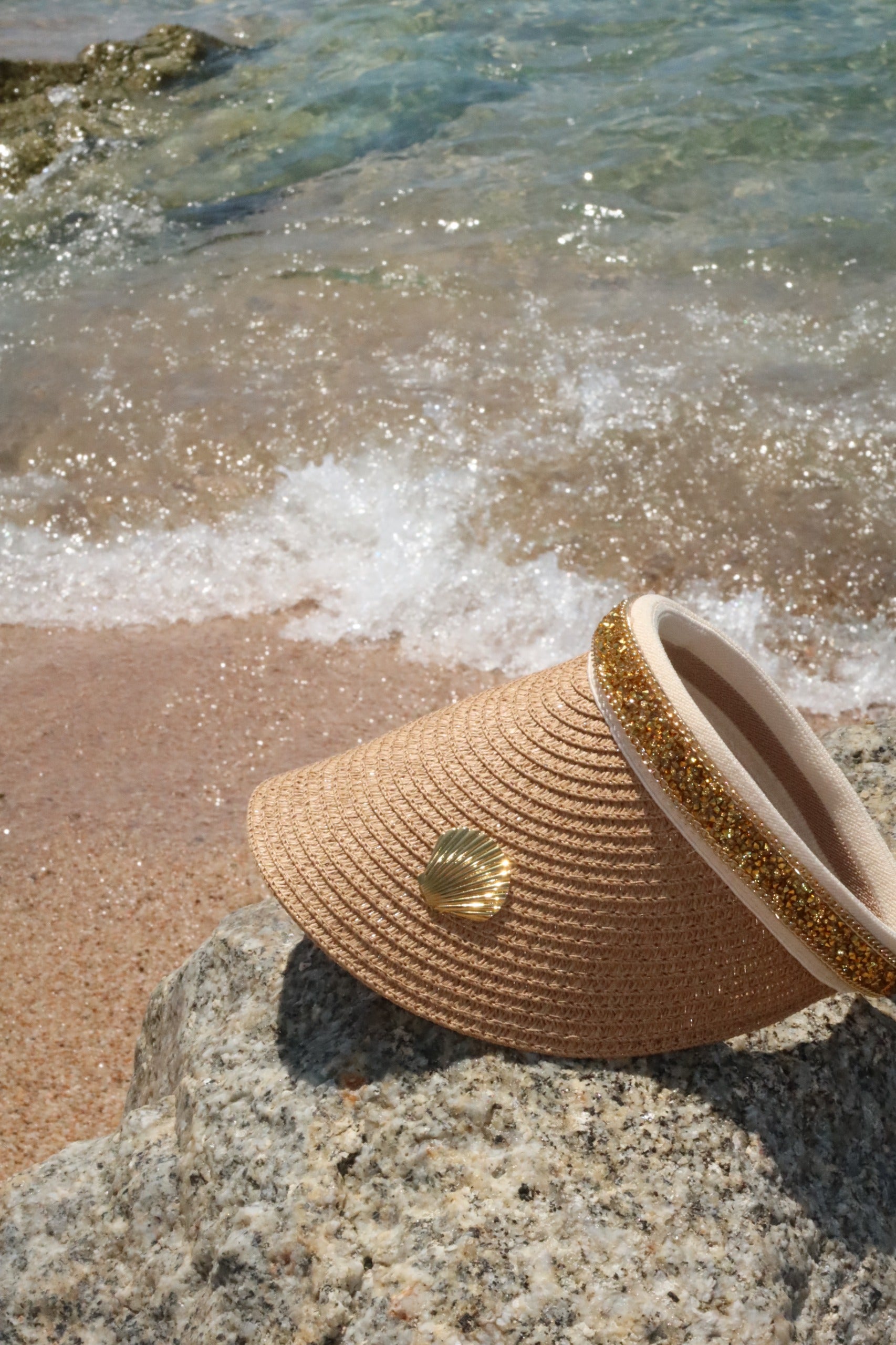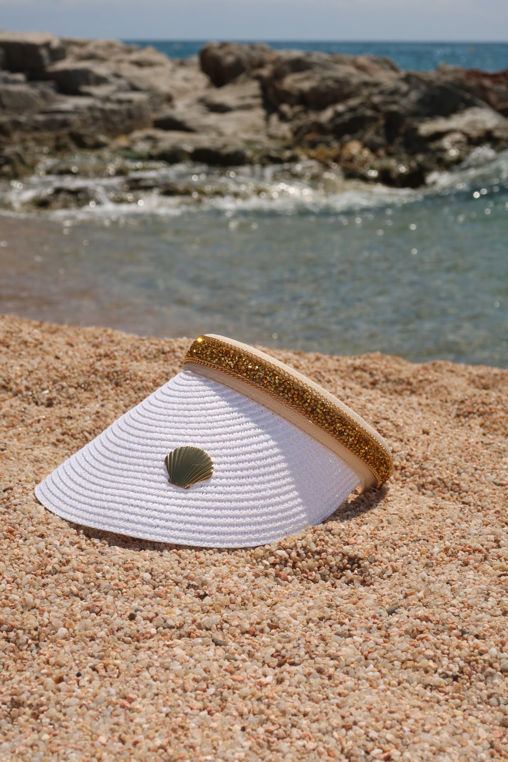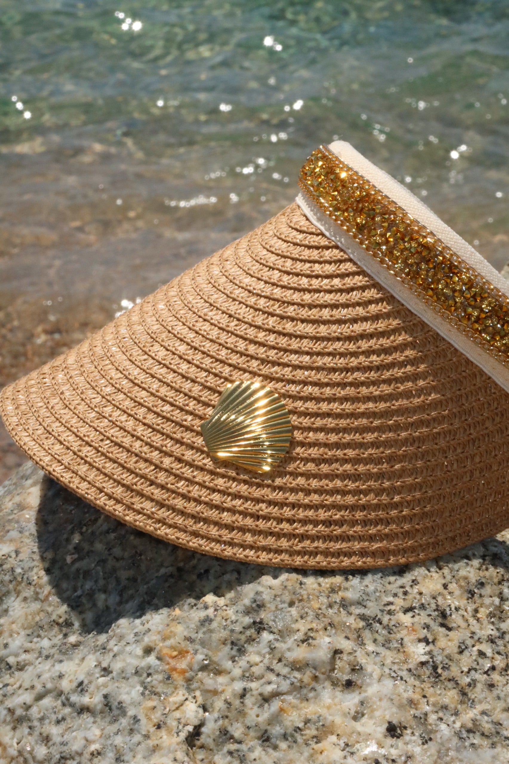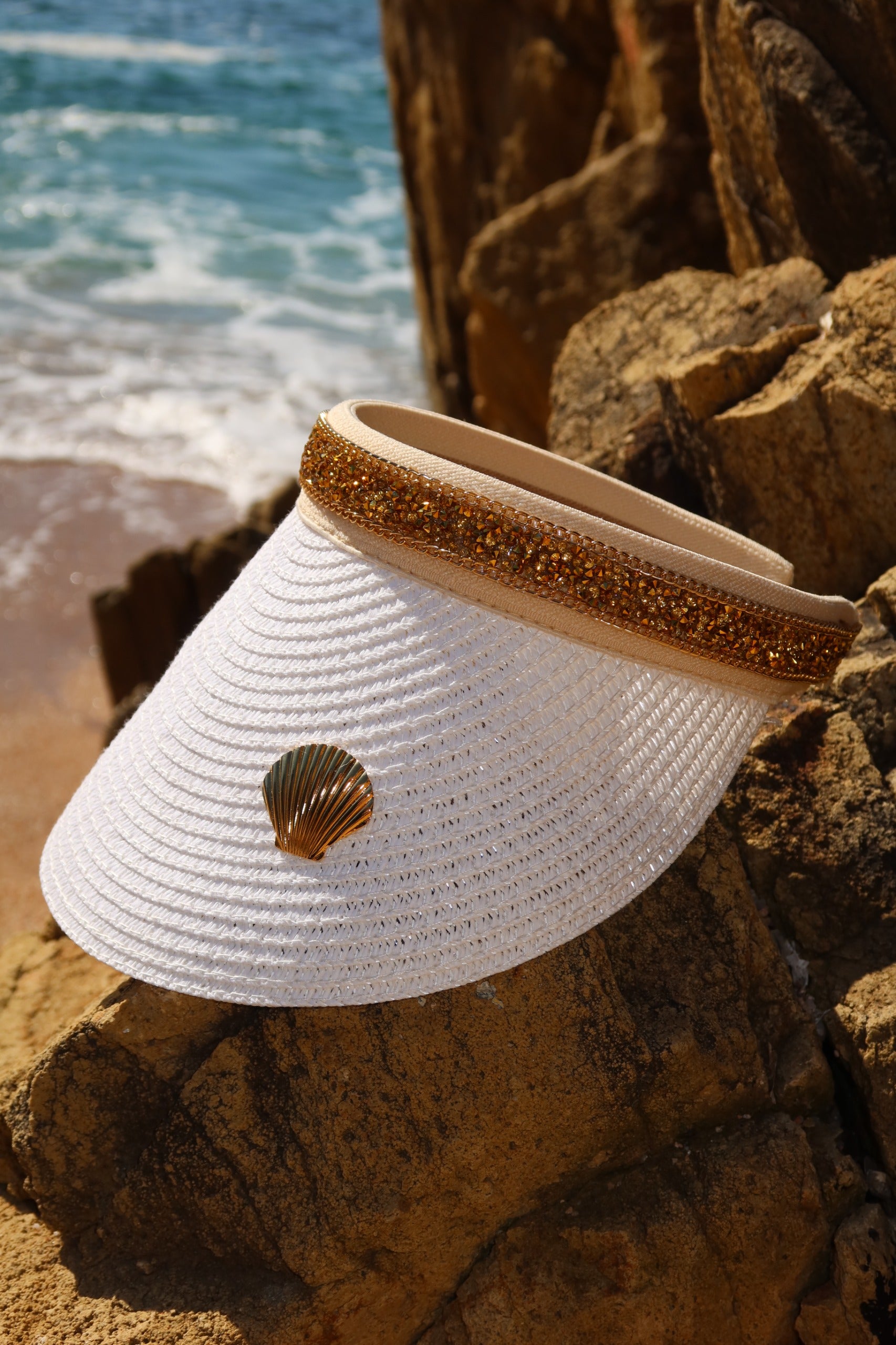 Con cinta luminosa y caracol metálico, es la visera que transforma cualquier look en elegancia veraniega.